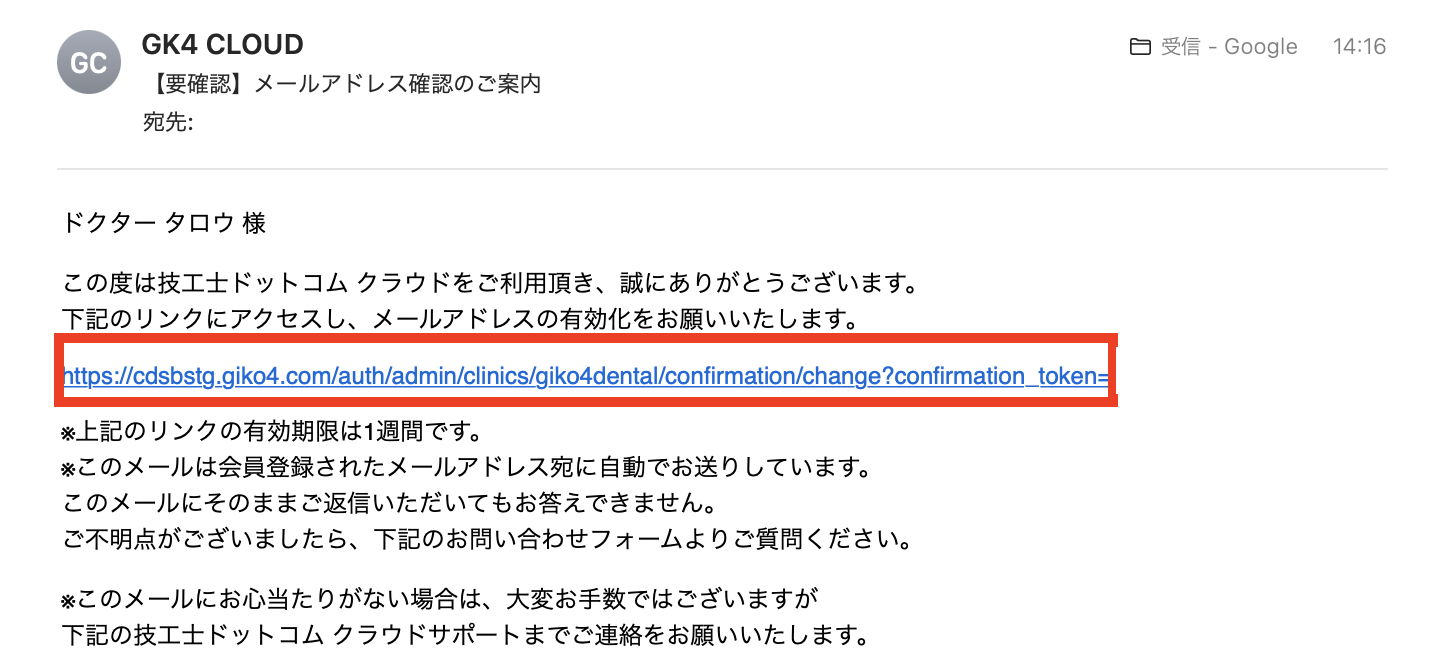 STEP5. 更新後に変更先のメールアドレス宛へ以下のようなメールが送信されるので、本文内のリンクをクリックします(URLには有効期限がありますので、期限内にクリックしてください)。