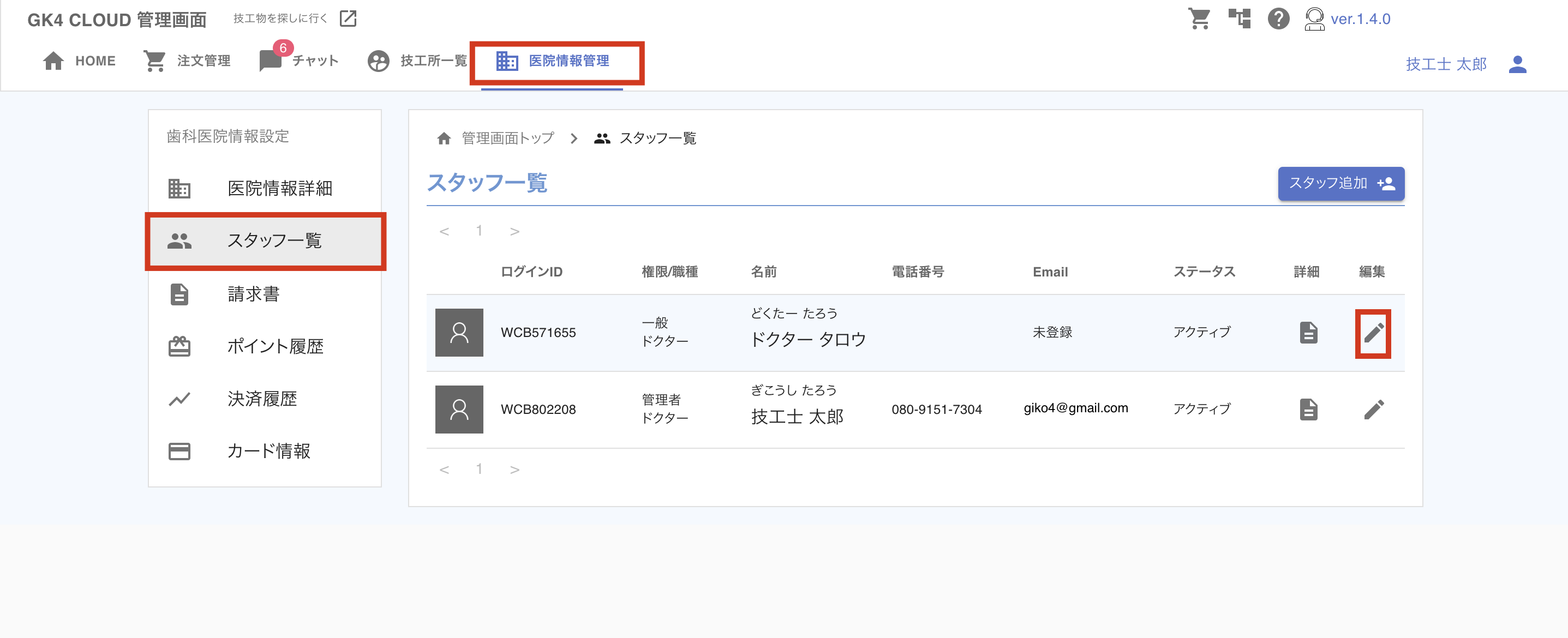 STEP2. [GK4 CLOUD管理画面]→[医院情報管理]タブを表示して、歯科医院情報設定欄から「スタッフ一覧」をクリックします。
