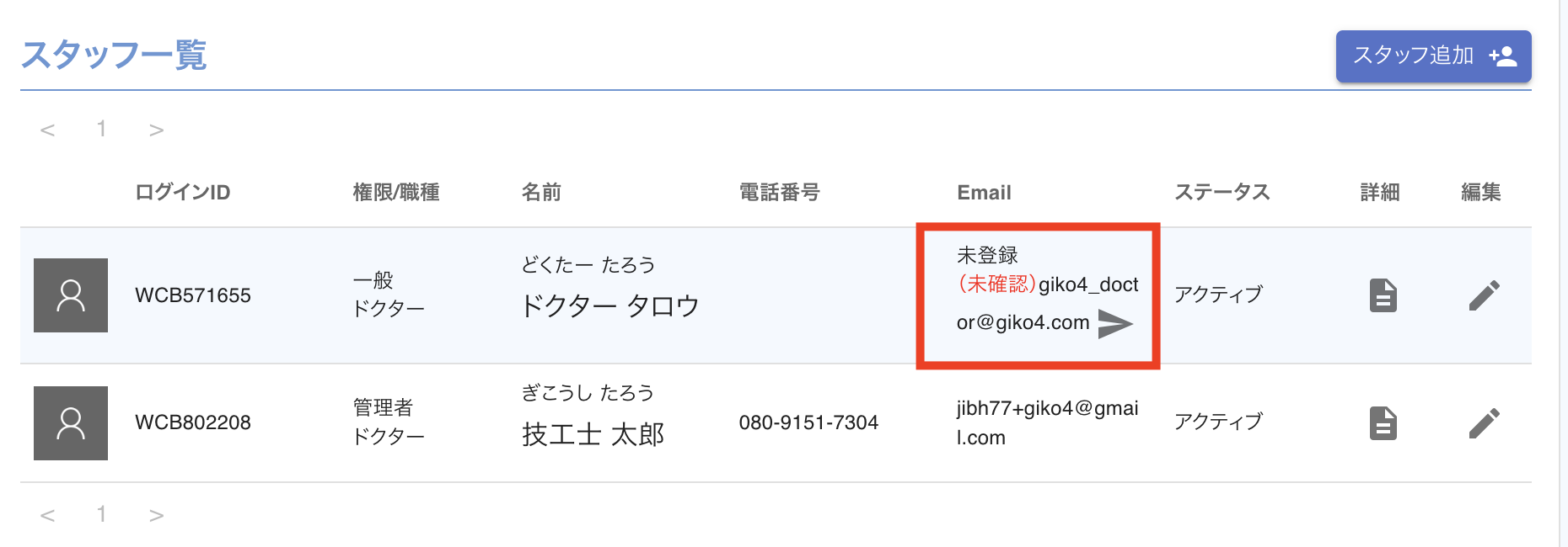 STEP3. メールアドレスを登録・変更したいスタッフから「編集」をクリックします。