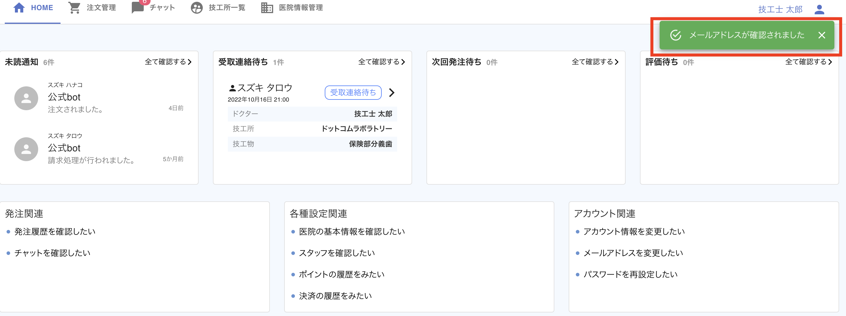 STEP6. リンクをクリックすると、[メールアドレス認証が完了しました]と表示されますので、管理画面からメールアドレスが変更されていることをご確認ください。