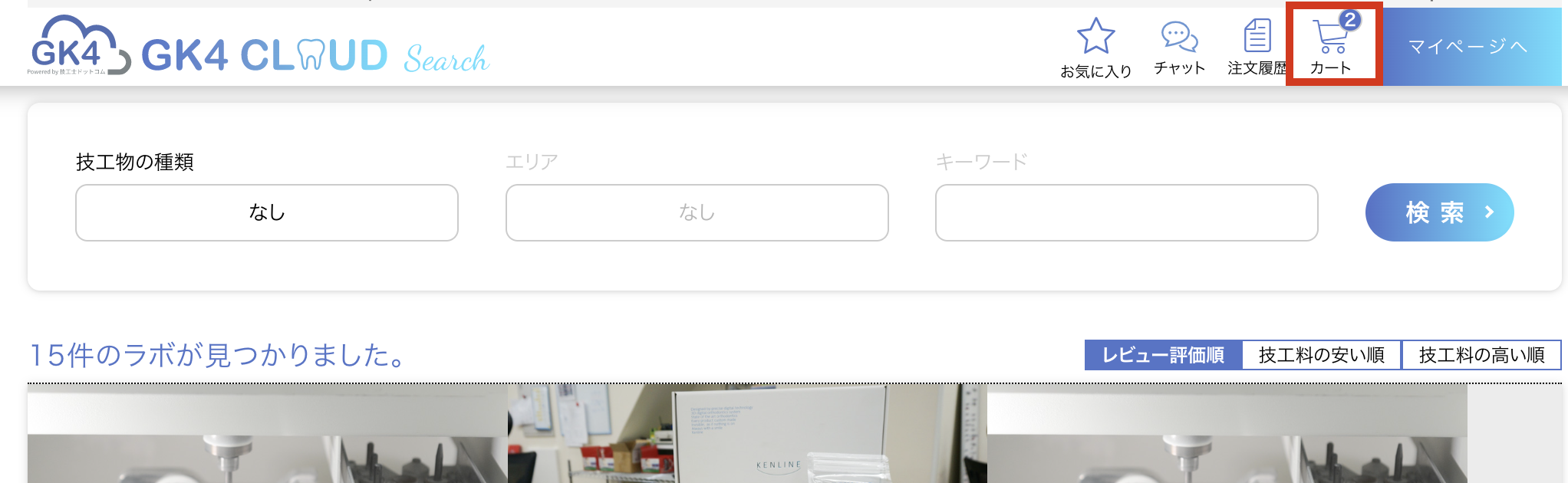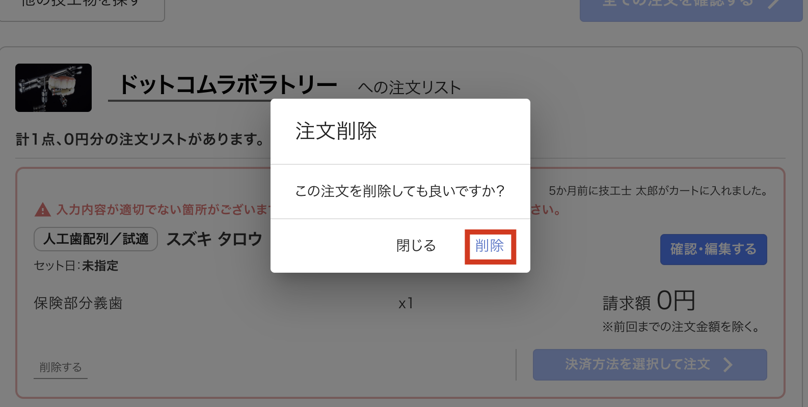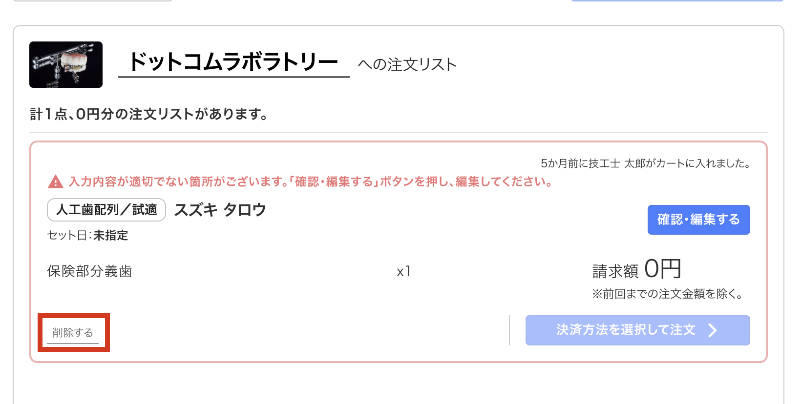 カート内の技工物を消したい場合は、注文を1つずつ削除することでご対応ください。