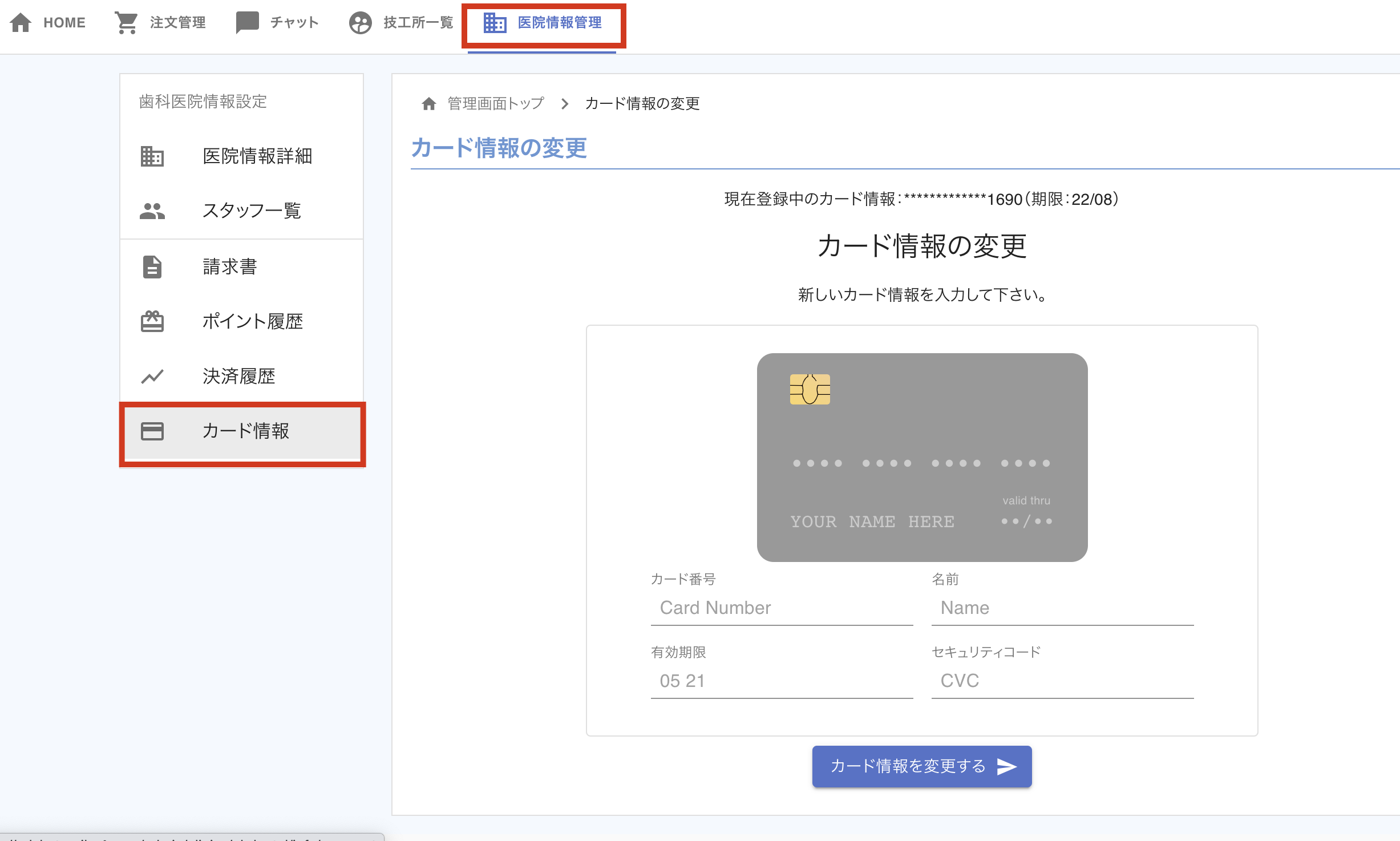 クレジットカード情報を変更したい場合、アカウント管理画面の、[医院情報詳細]から変更できます。