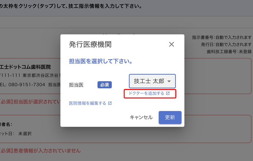 担当医が登録されていない場合は、赤枠の「ドクターを追加」するから新しく登録をしてください。