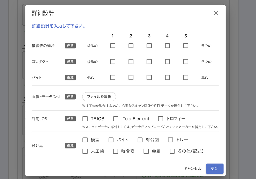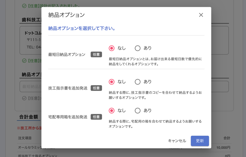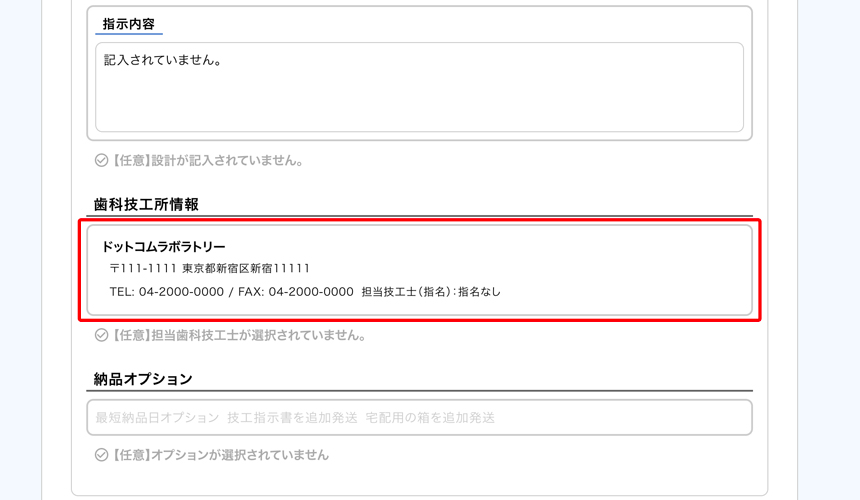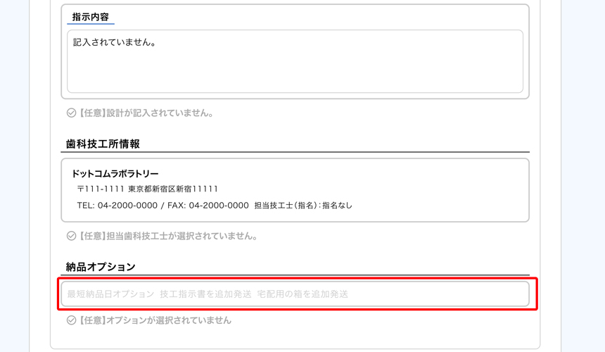 この項目は任意の項目になっており、最短納品オプション・技工指示書の追加発送・宅配専用箱を追加発送がある方はこの項目から選択してください。