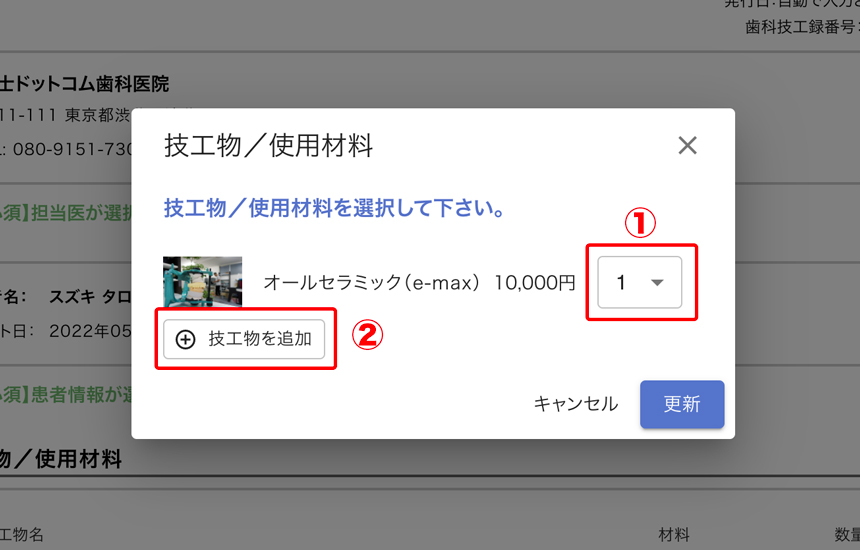 2歯同時に注文したい場合や、新たに技工物を追加したい場合は、ここから追加してください。