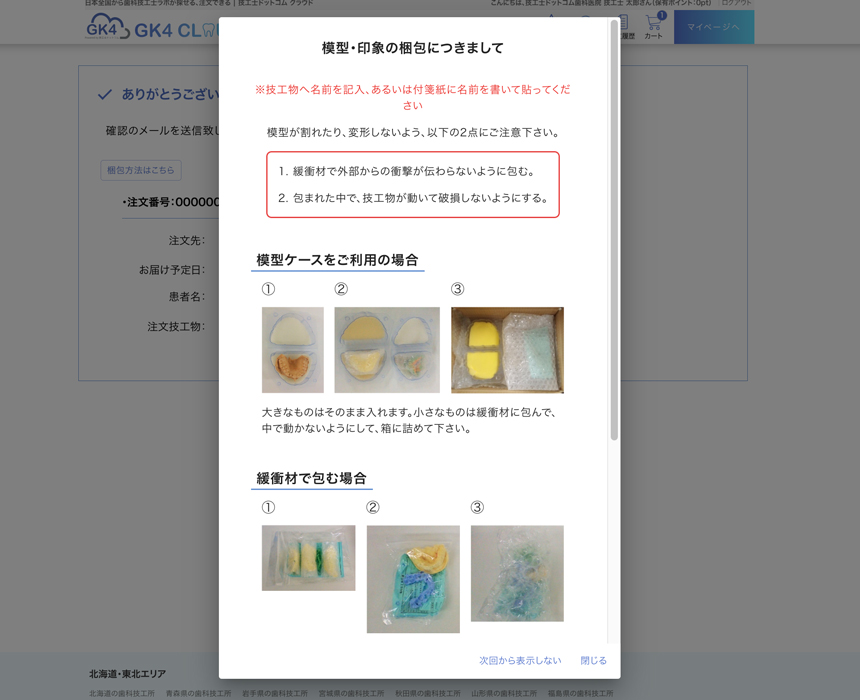 「注文を確定する」をクリックした後、「模型・印象の梱包について注意喚起」が表示されますので確認後、「閉じる」ボタンをクリックしてください。
