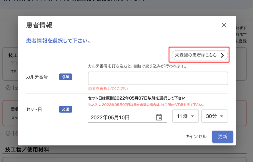 未登録の患者の場合、右上の「未登録の患者はこちら」をクリックし、新規患者登録を行ってください。