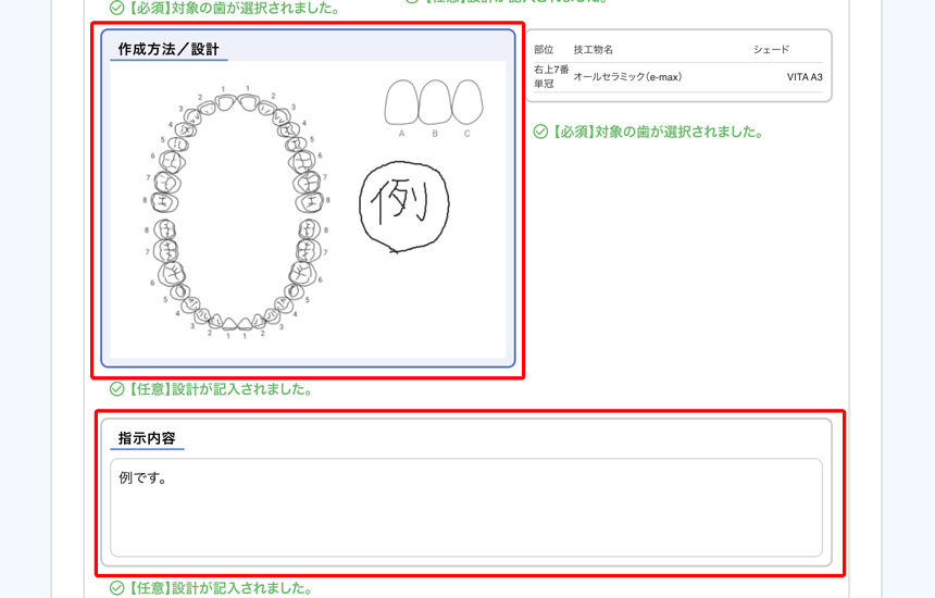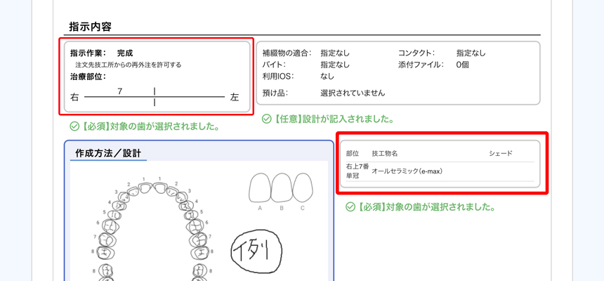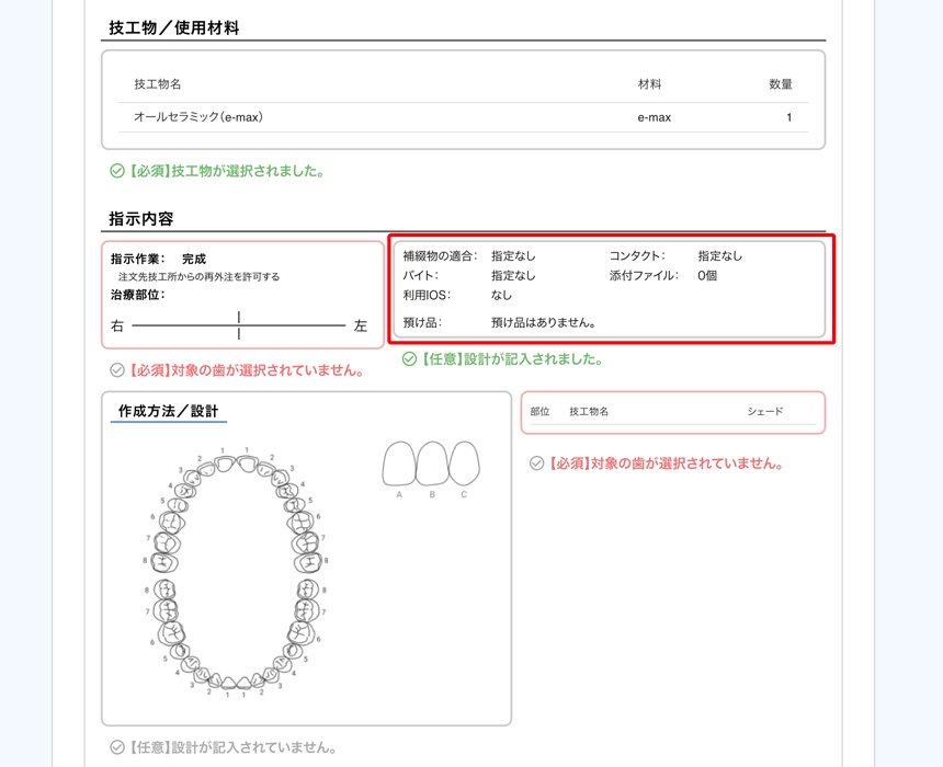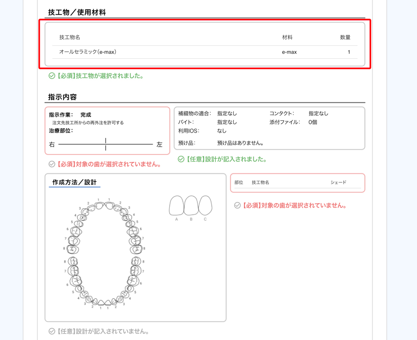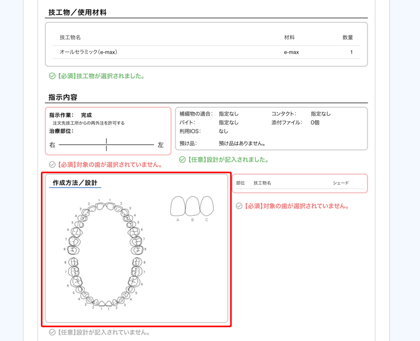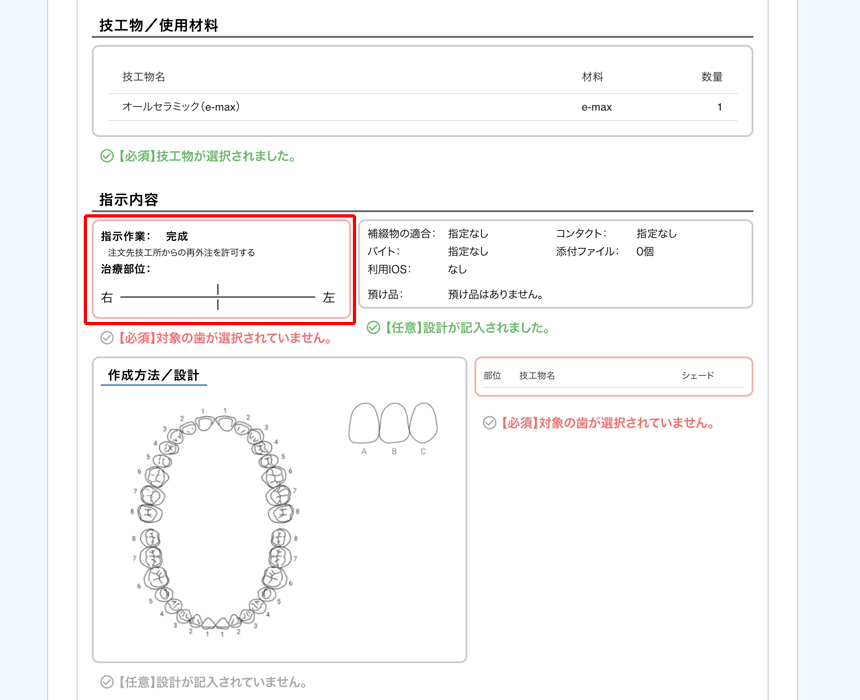 4つ目、指示内容の左側は必須項目になります。ここでは、セットする歯の部位を選択してください。