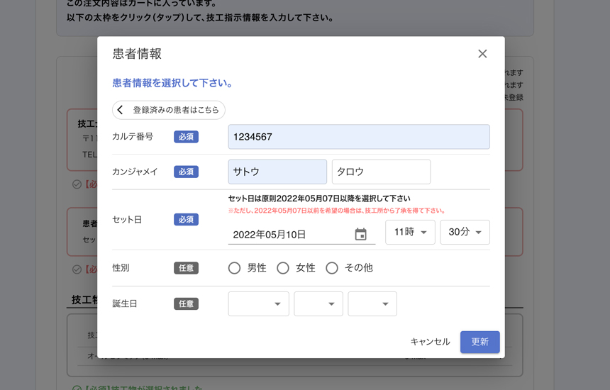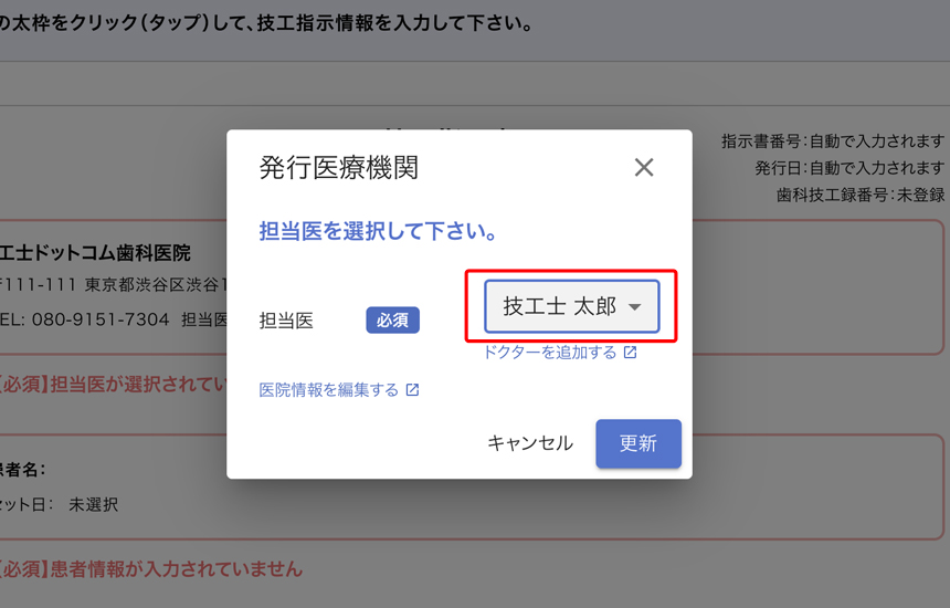 入力選択が完了したら「更新」をクリックすると、指示書内に患者情報が反映されます。