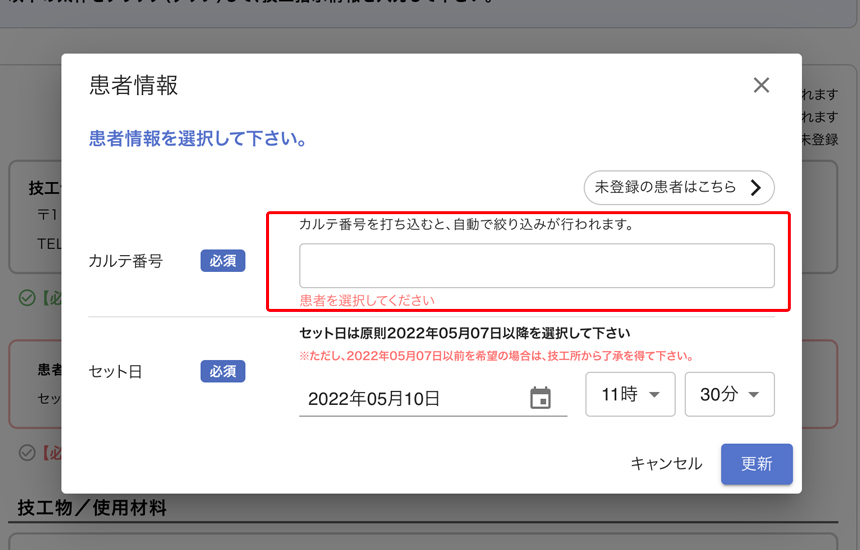 新規で患者を登録する場合、患者のカルテ番号・患者名(カタカナ)・セット日が必須になります。一度登録された患者は、次回からカルテ番号のみで絞り込み検索を行うことができます。