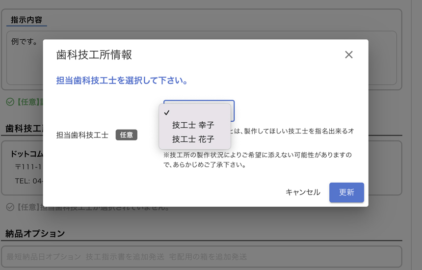 この項目は任意の項目になります。歯科技工士を指名したい場合は、こちらから選択してください。