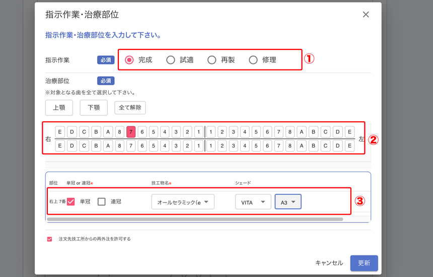 ①の指示作業では、デフォルトで「完成」が」選択されています。試適などの場合は、変更を忘れないようにご注意ください。