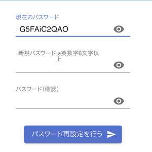 最後にパスワードを設定します。「現在のパスワード欄」には既に送信されているメールに記載された初期パスワードが入力されています。新しいパスワード欄に新規パスワード(英数字8文字以上)を入力し、入力確認のために確認用パスワード欄に新規パスワードを再度入力し、最下部にある「パスワードの再設定」をクリックしてください。