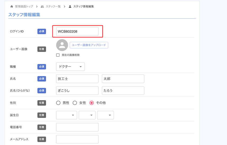 画面が遷移し、スタッフ情報の編集画面が表示されるのでスタッフ情報を入力します。もし覚えやすいログインIDに変更したい場合は自由に変更して頂いて結構です(初期登録時のログインID欄はシステム内で自動発行されたログインIDが自動入力されています)。