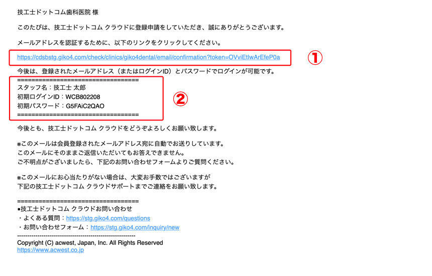 基本情報に登録したメールアドレス宛に、初期ログインIDと初期パスワードが記載されたメールが届きます。届いたらまず初めにメール内の①認証用URLをクリックしてメールアドレスの認証を行ってください。