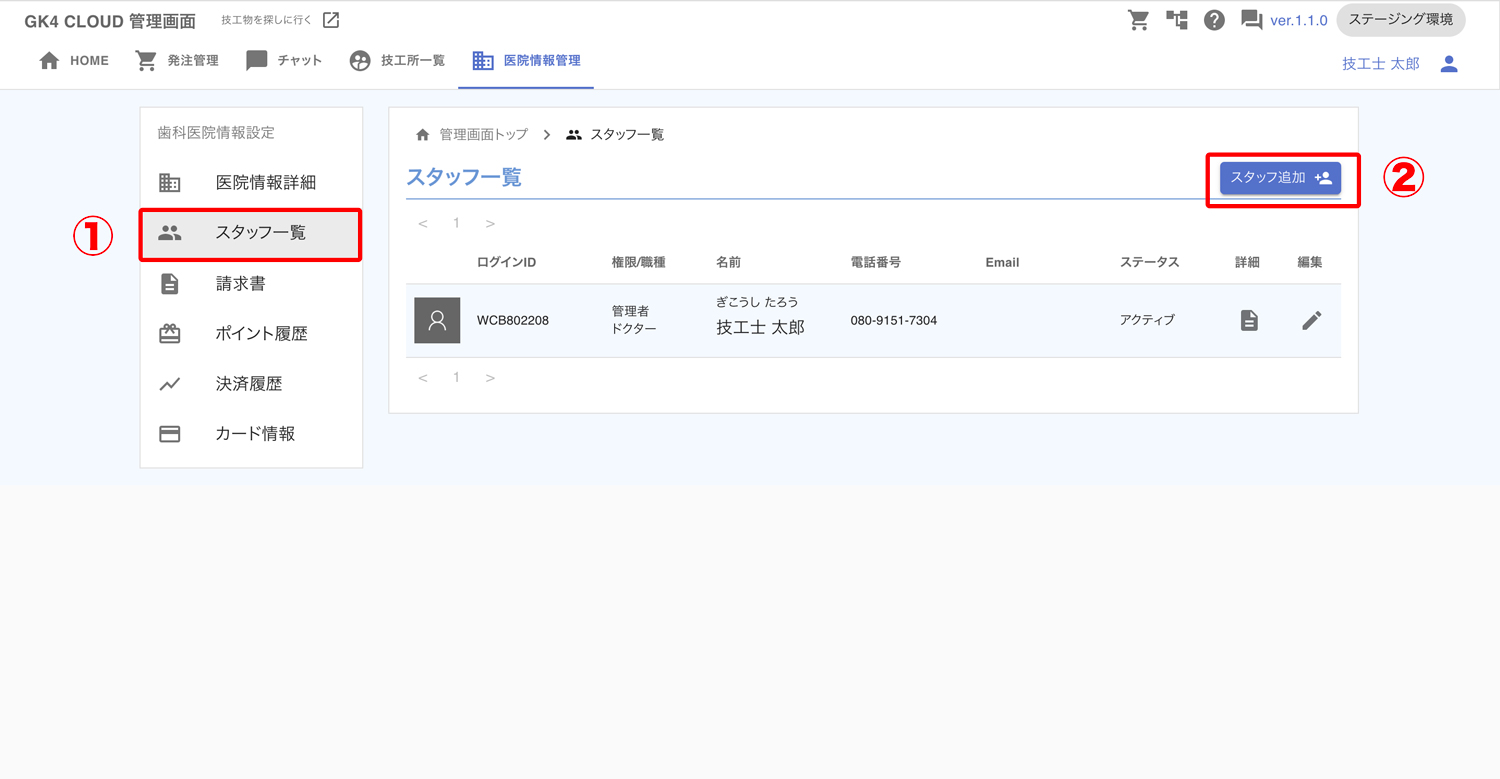 ①「スタッフ一覧」をクリック